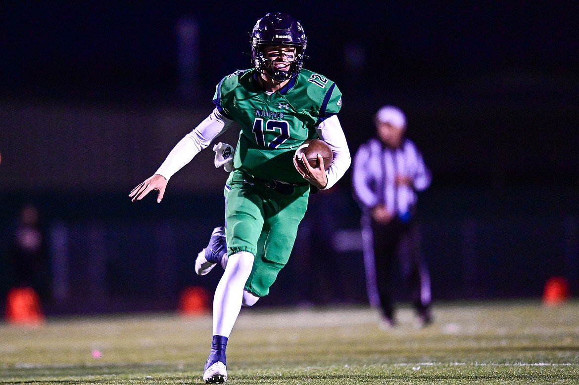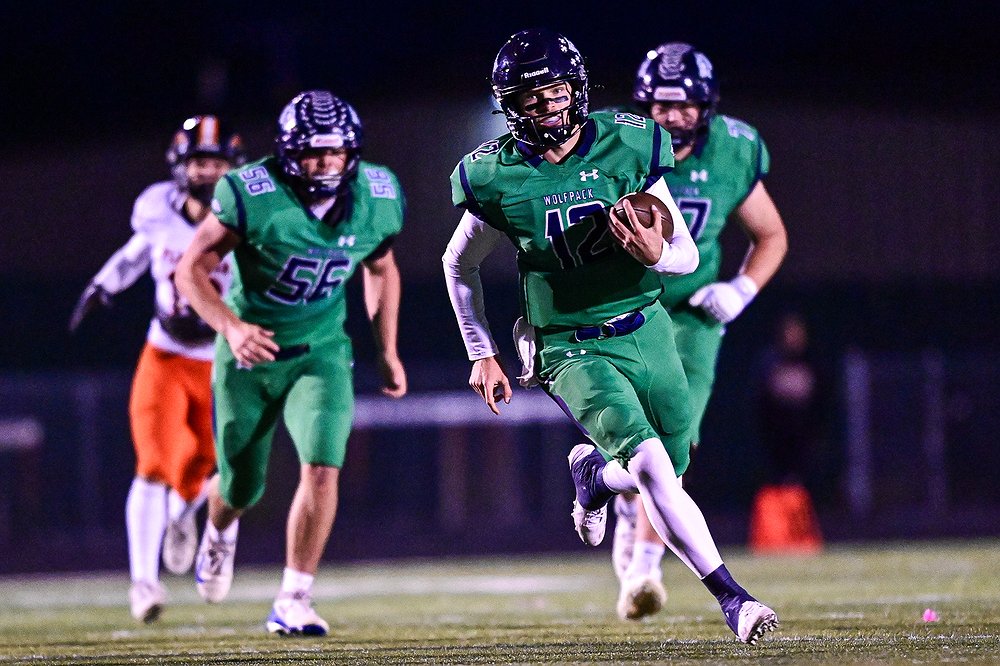 Glacier quarterback Jackson Presley (12) picks up yardage on a run in the first quarter against Flathead at Legends Stadium on Thursday, Oct. 16. (Casey Kreider/Daily Inter Lake)