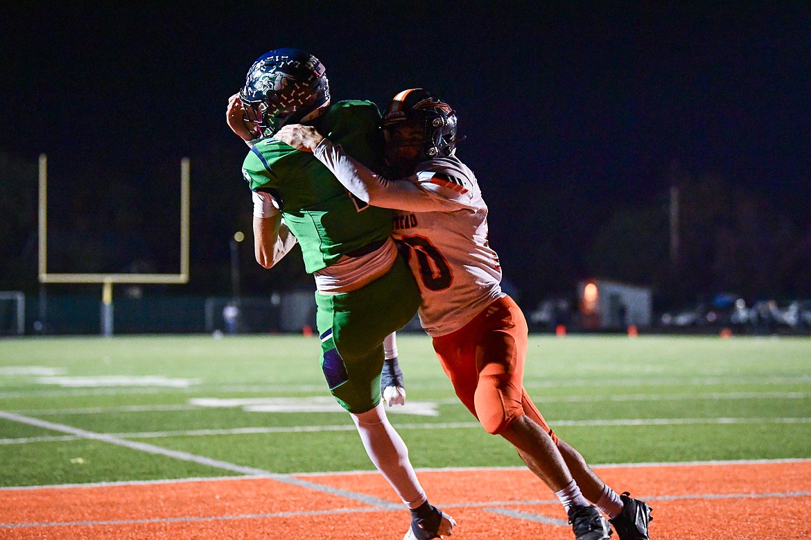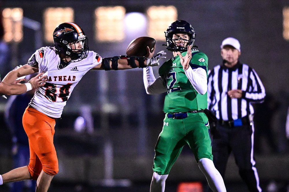 Flathead linebacker Nolan Campbell (24) deflects a pass attempt by Glacier quarterback Jackson Presley (12) in the second quarter at Legends Stadium on Thursday, Oct. 16. (Casey Kreider/Daily Inter Lake)
