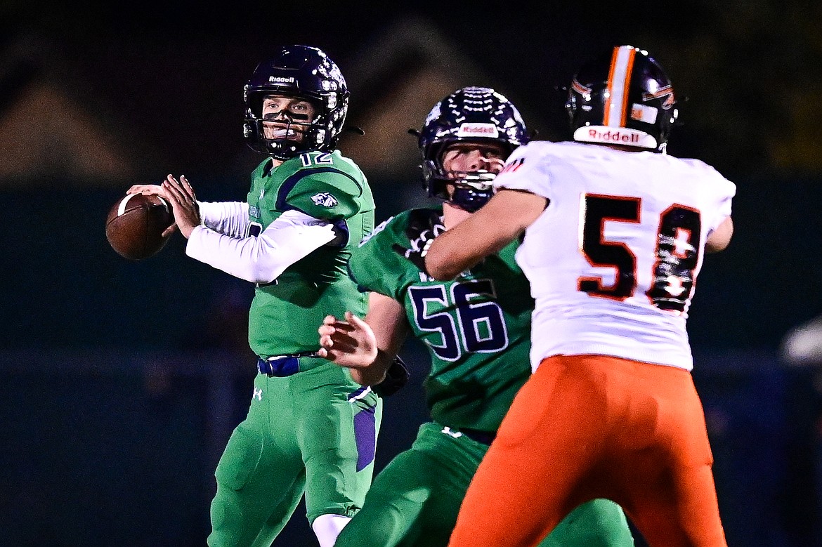Glacier quarterback Jackson Presley (12) throws a 33-yard touchdown pass to wide receiver Austin Gragg in the first quarter against Flathead at Legends Stadium on Thursday, Oct. 16. (Casey Kreider/Daily Inter Lake)