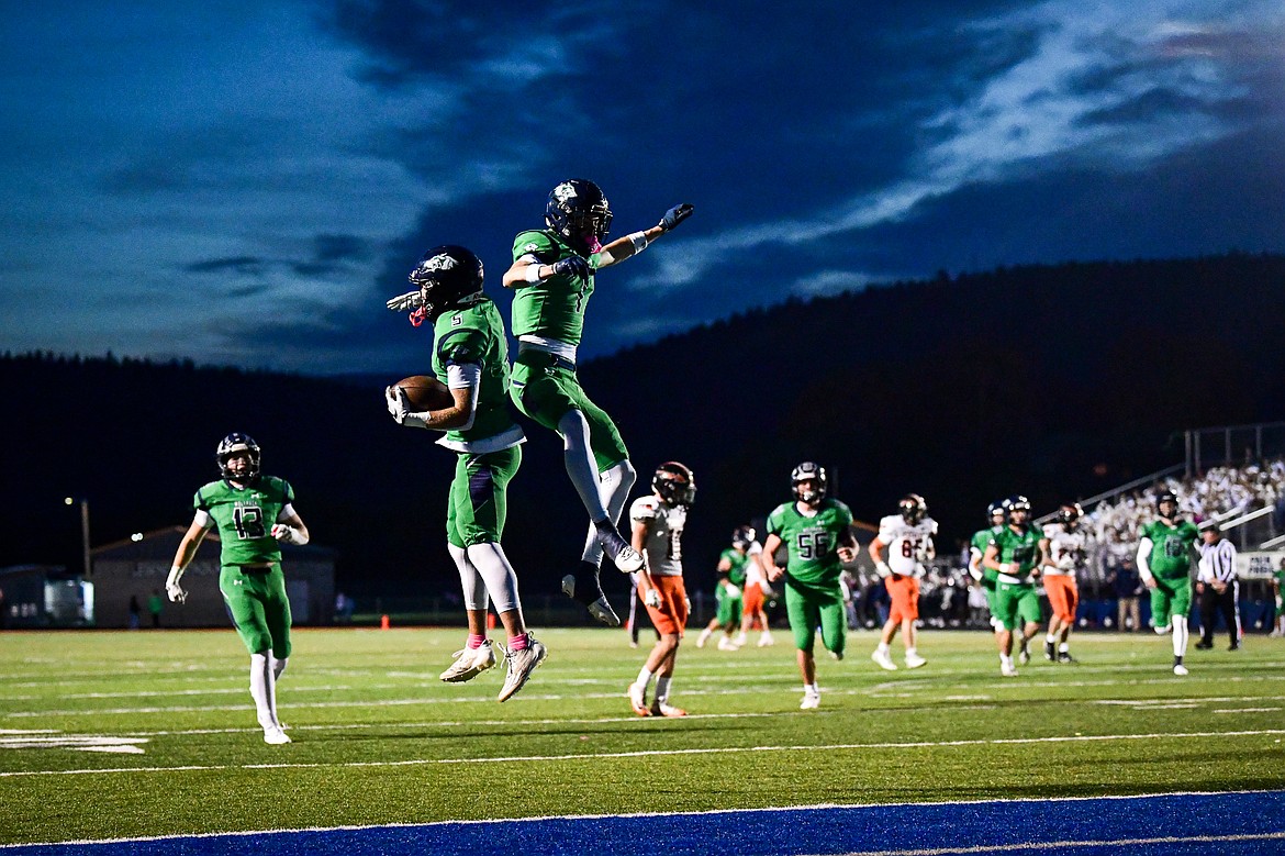 Glacier wide receivers Austin Gragg (5) and Cooper Pelc (1) celebrate after Gragg's 33-yard touchdown reception in the first quarter against Flathead at Legends Stadium on Thursday, Oct. 16. (Casey Kreider/Daily Inter Lake)