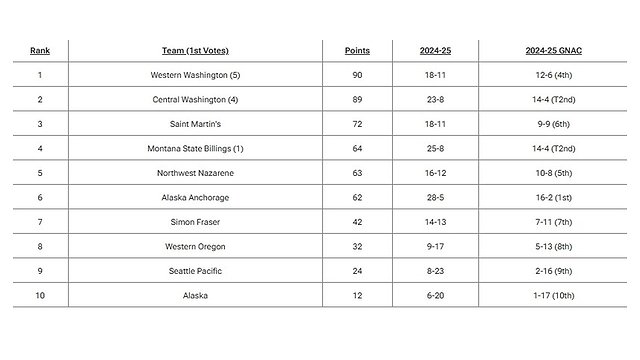 The conference portion of the 2025-26 schedule gets off to an early start with an opening round of games Dec. 3-6. The rest of the 18-game league schedule will kick off on New Year’s Day with a full slate of games. The top six teams in the GNAC regular-season standings will earn spots in the 2026 GNAC Women’s Basketball Championships, which run March 5-7 at Western Washington’s Carver Gym in Bellingham.