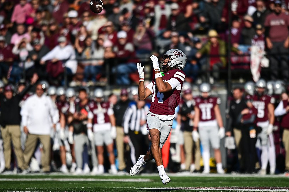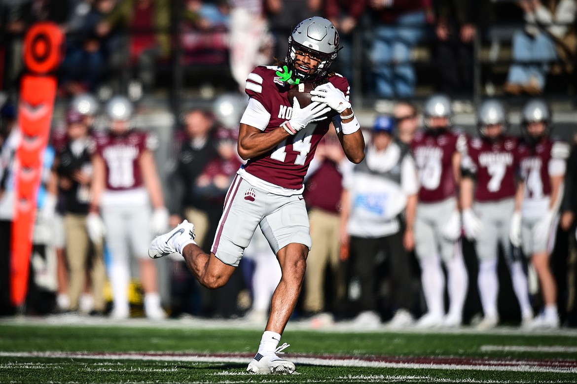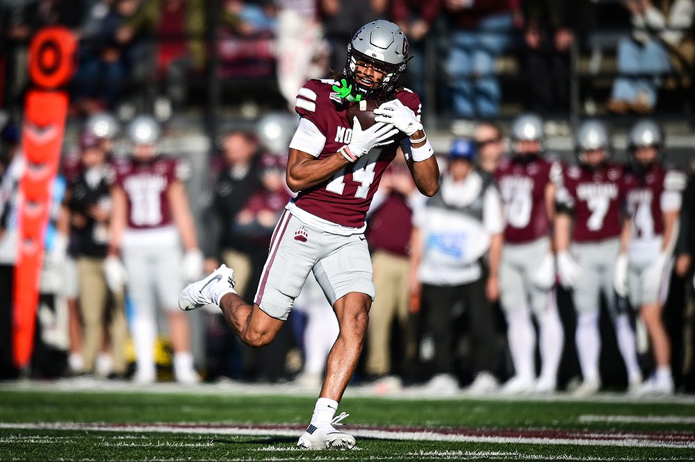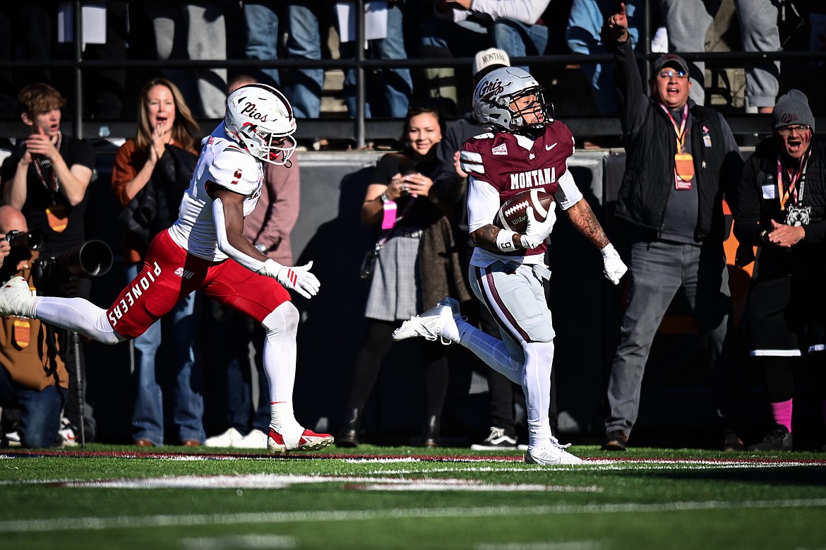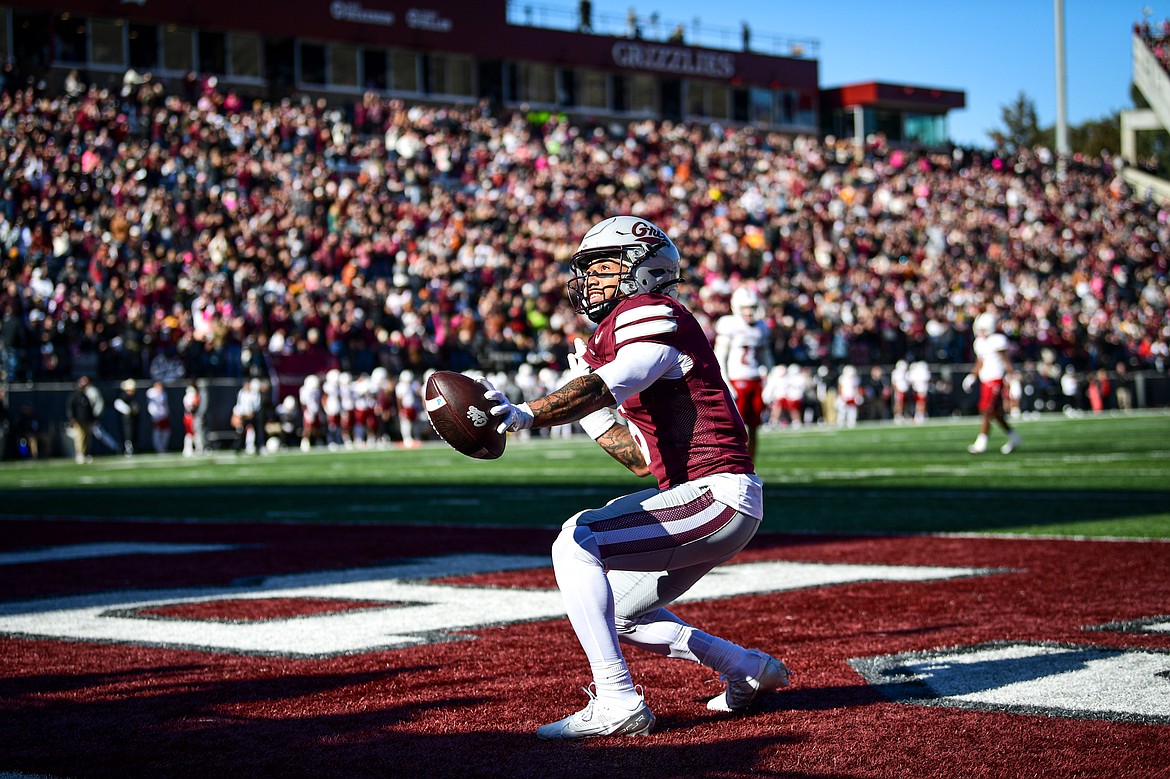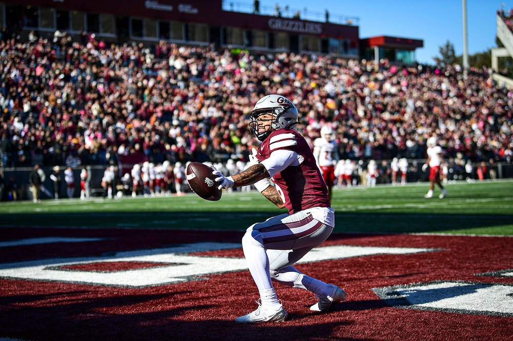 Grizzlies wide receiver Korbin Hendrix (14) catches a 49-yard touchdown reception in the fourth quarter against Sacred Heart at Washington-Grizzly Stadium on Saturday, Oct. 18. (Casey Kreider/Daily Inter Lake)