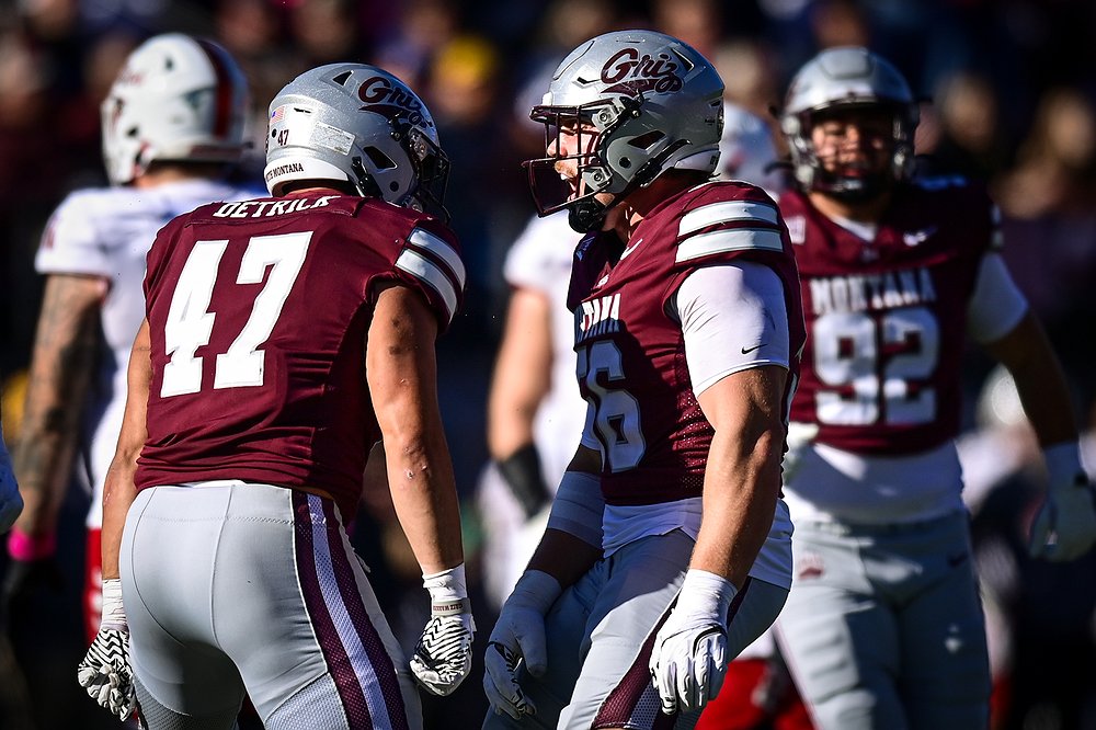 Grizzlies defenders Kellen Detrick (47) and Hunter Peck (56) celebrate after a sack in the third quarter against Sacred Heart at Washington-Grizzly Stadium on Saturday, Oct. 18. (Casey Kreider/Daily Inter Lake)