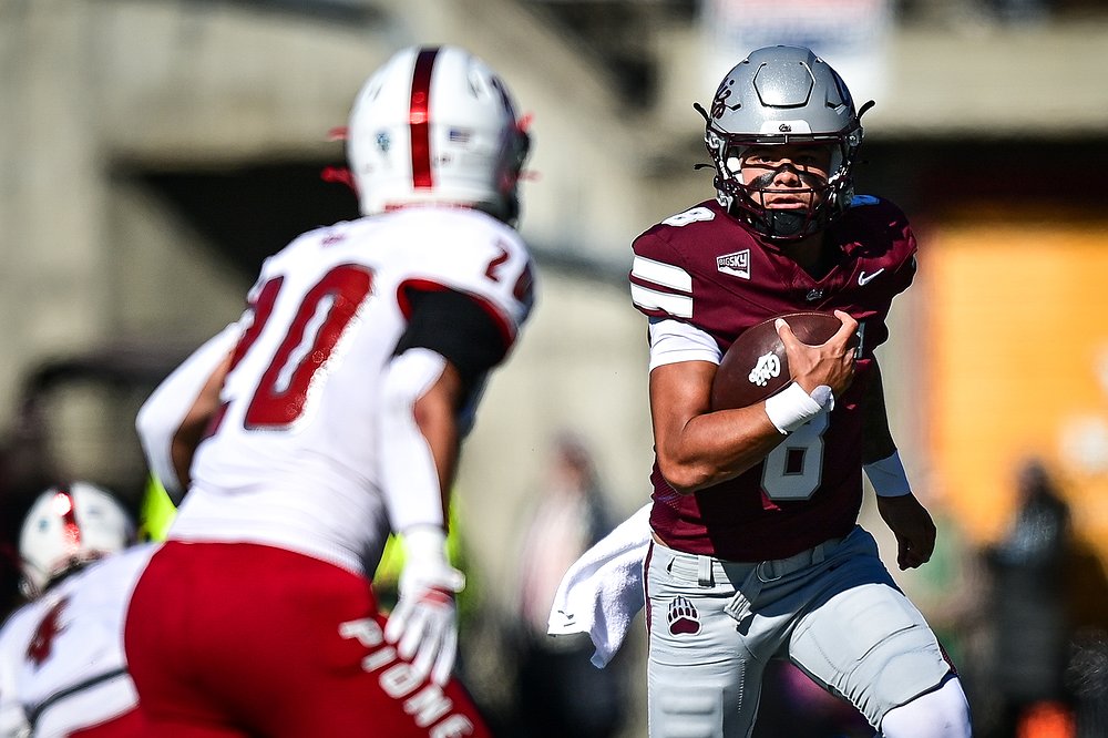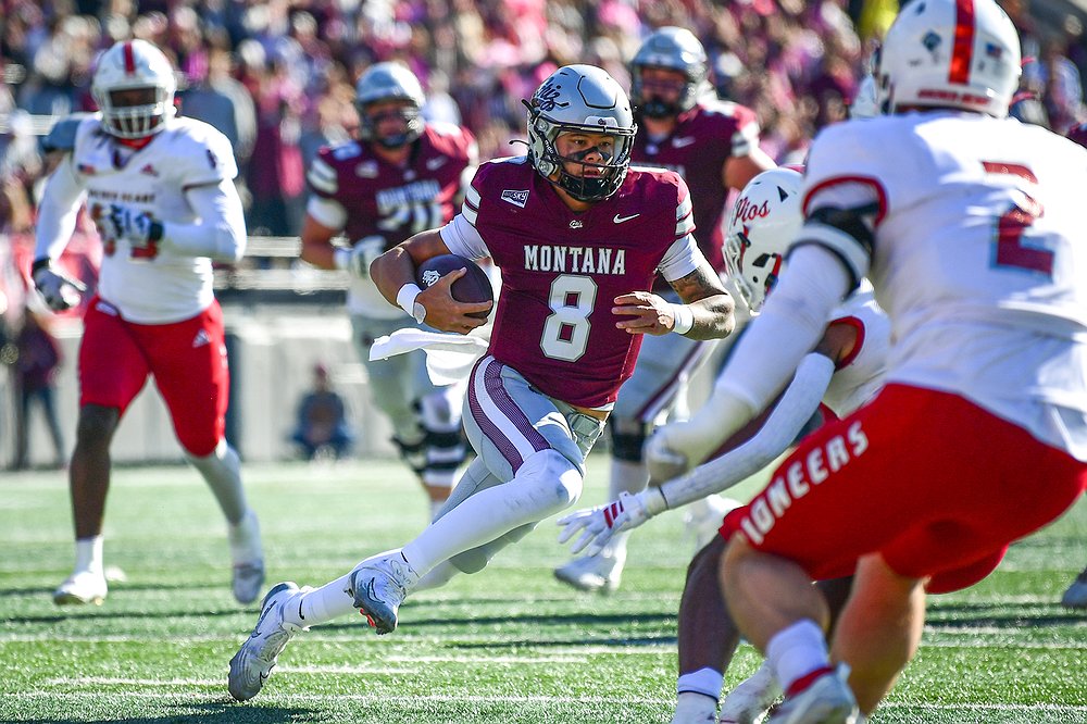 Grizzlies quarterback Keali'i Ah Yat (8) scrambles for a gain in the first quarter against Sacred Heart at Washington-Grizzly Stadium on Saturday, Oct. 18. (Casey Kreider/Daily Inter Lake)