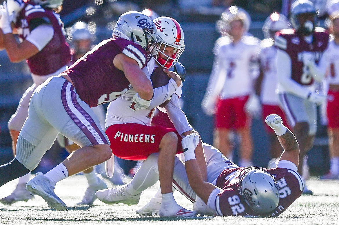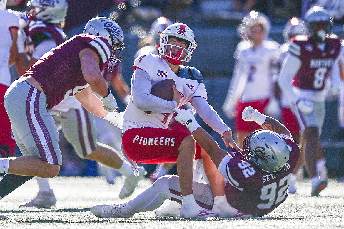 Grizzlies defensive end Hunter Peck (56) sacks Sacred Heart quarterback Jack Snyder (14) in the fourth quarter at Washington-Grizzly Stadium on Saturday, Oct. 18. (Casey Kreider/Daily Inter Lake)