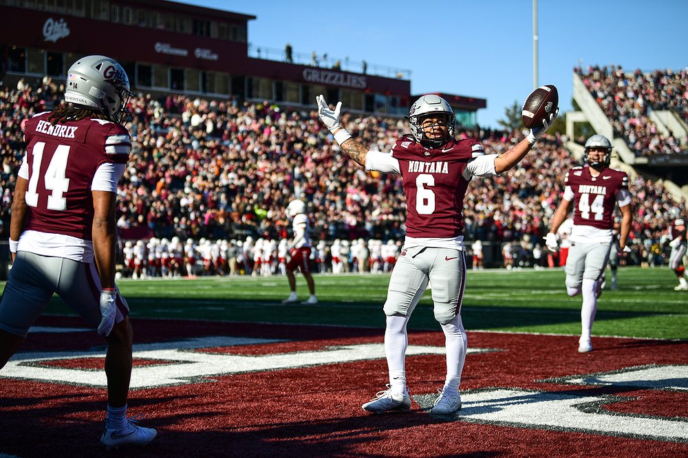 Grizzlies wide receiver Michael Wortham (6) celebrates after a 43-yard touchdown reception in the first quarter against Sacred Heart at Washington-Grizzly Stadium on Saturday, Oct. 18. (Casey Kreider/Daily Inter Lake)
