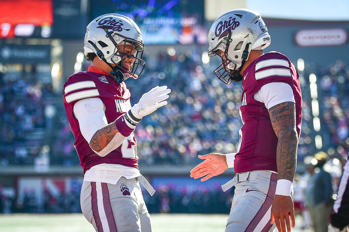 Grizzlies running back Stevie Rocker Jr. (21) celebrates with quarterback Keali'i Ah Yat (8) after Ah Yat's 3-yard touchdown run in the second quarter against Sacred Heart at Washington-Grizzly Stadium on Saturday, Oct. 18. (Casey Kreider/Daily Inter Lake)