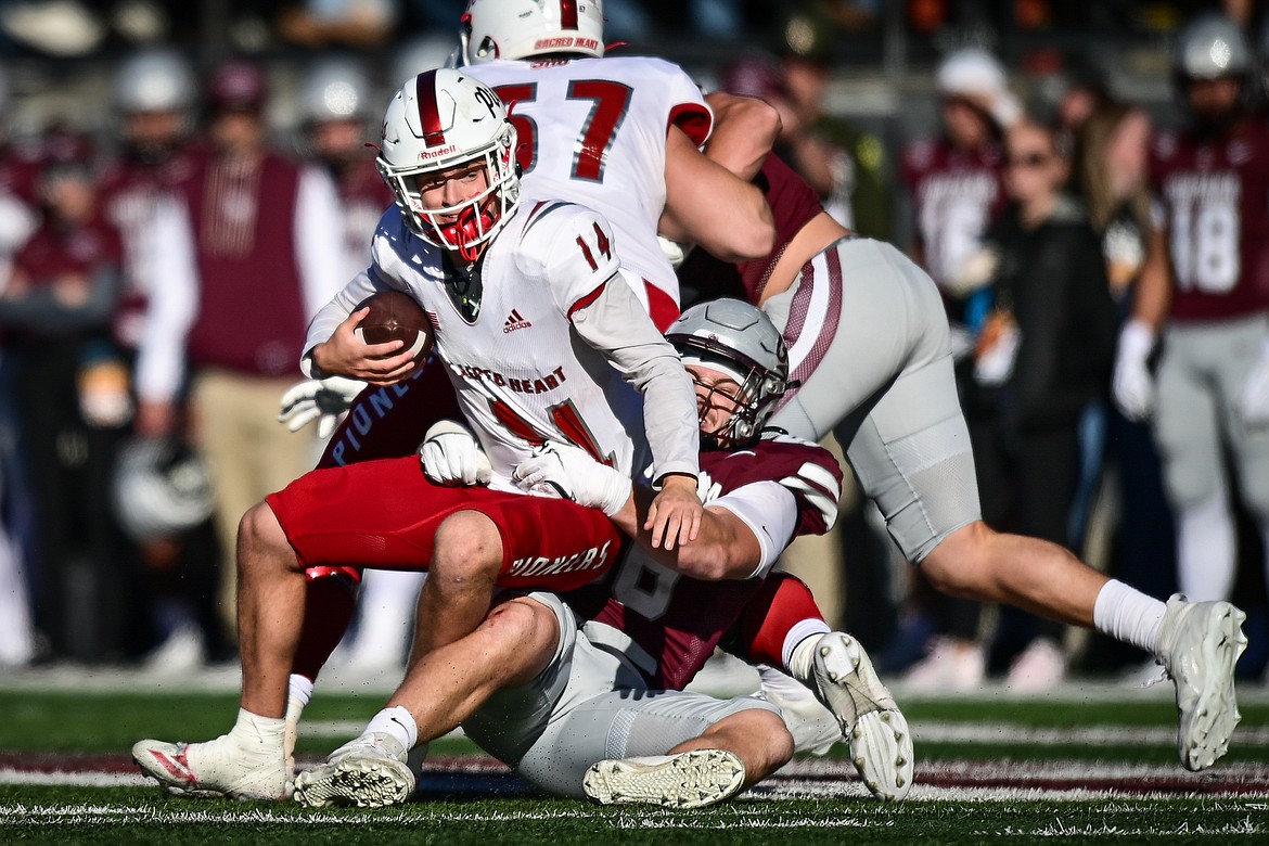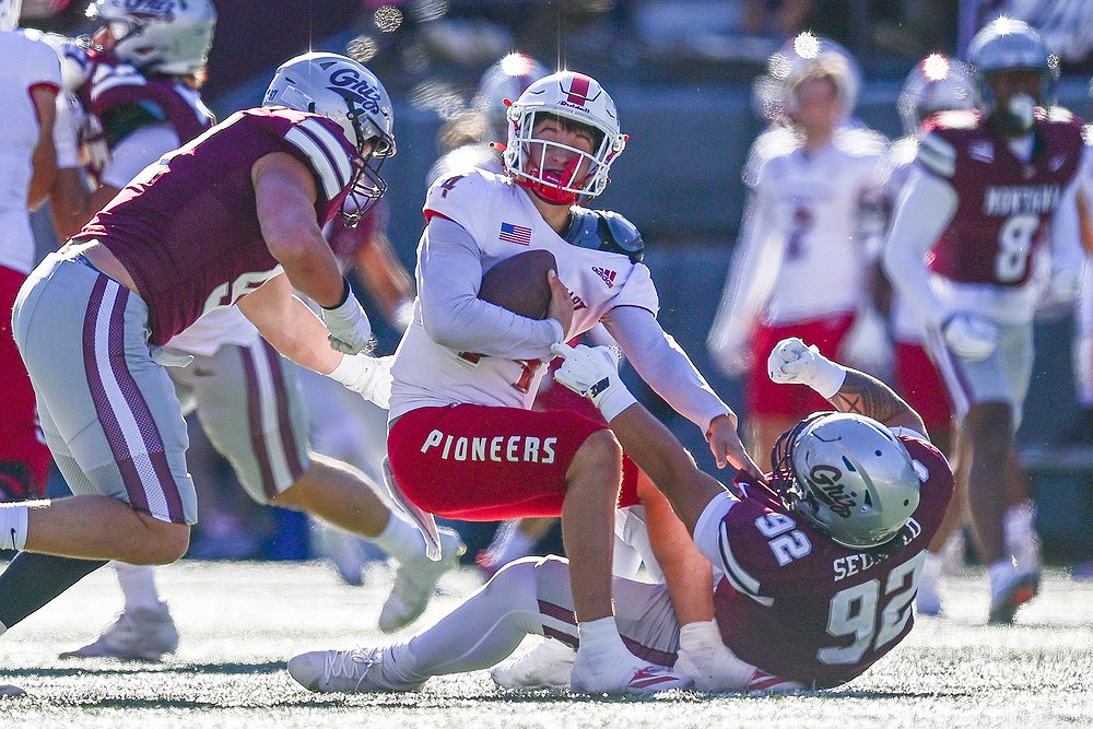 Grizzlies defenders Hayden Schwartz (97) and Zekiel Seumalo (92) sack Sacred Heart quarterback Jack Snyder (14) in the third quarter at Washington-Grizzly Stadium on Saturday, Oct. 18. (Casey Kreider/Daily Inter Lake)