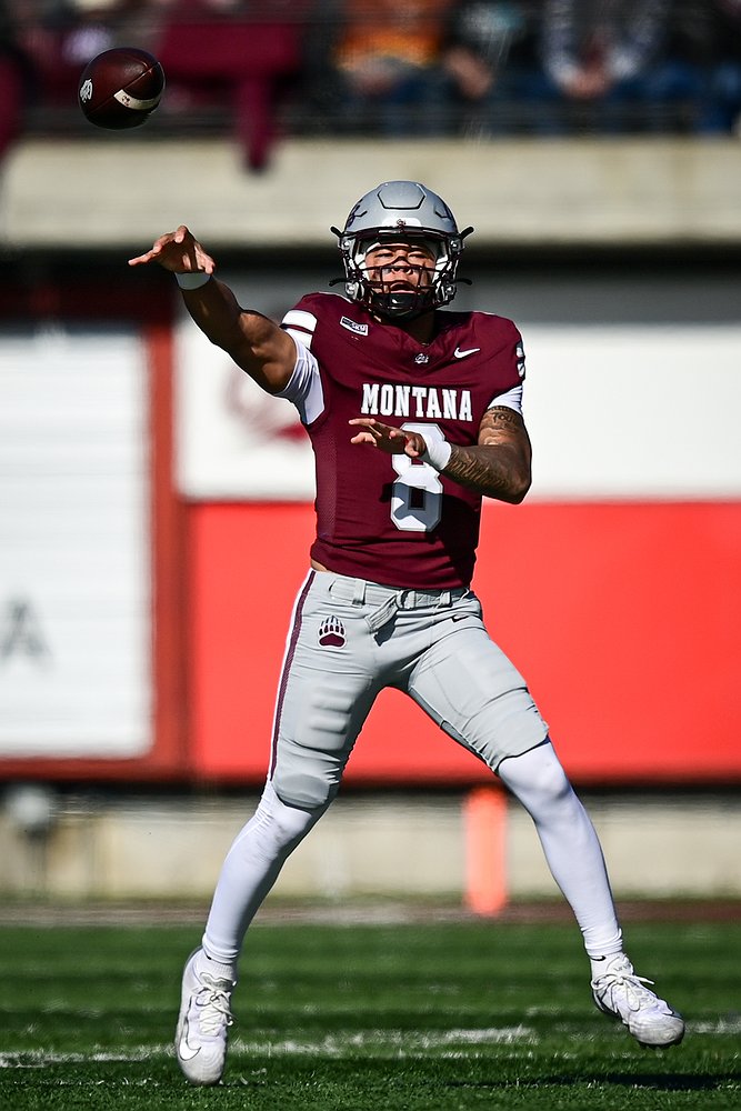 Grizzlies quarterback Keali'i Ah Yat (8) throws a 43-yard touchdown completion to wide receiver Michael Wortham in the first quarter against Sacred Heart at Washington-Grizzly Stadium on Saturday, Oct. 18. (Casey Kreider/Daily Inter Lake)