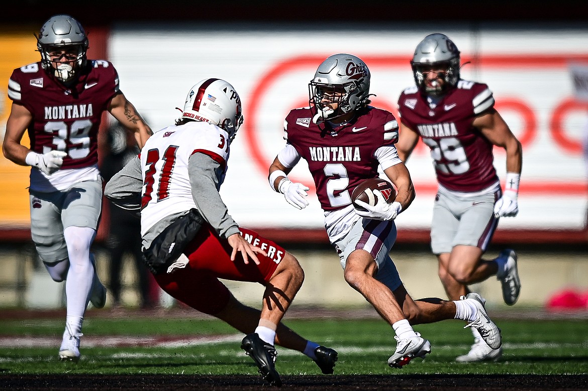 Grizzlies returner Drew Deck (2) returns a punt in the first quarter against Sacred Heart at Washington-Grizzly Stadium on Saturday, Oct. 18. (Casey Kreider/Daily Inter Lake)