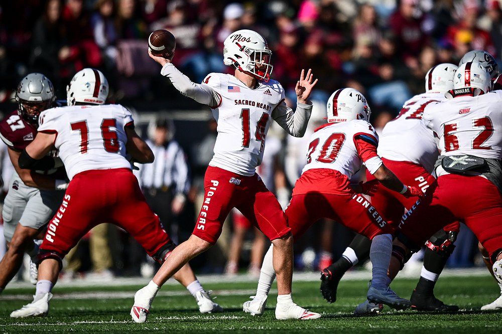 Sacred Heart quarterback Jack Snyder (14) drops back to pass in the first half against Montana at Washington-Grizzly Stadium on Saturday, Oct. 18. (Casey Kreider/Daily Inter Lake)