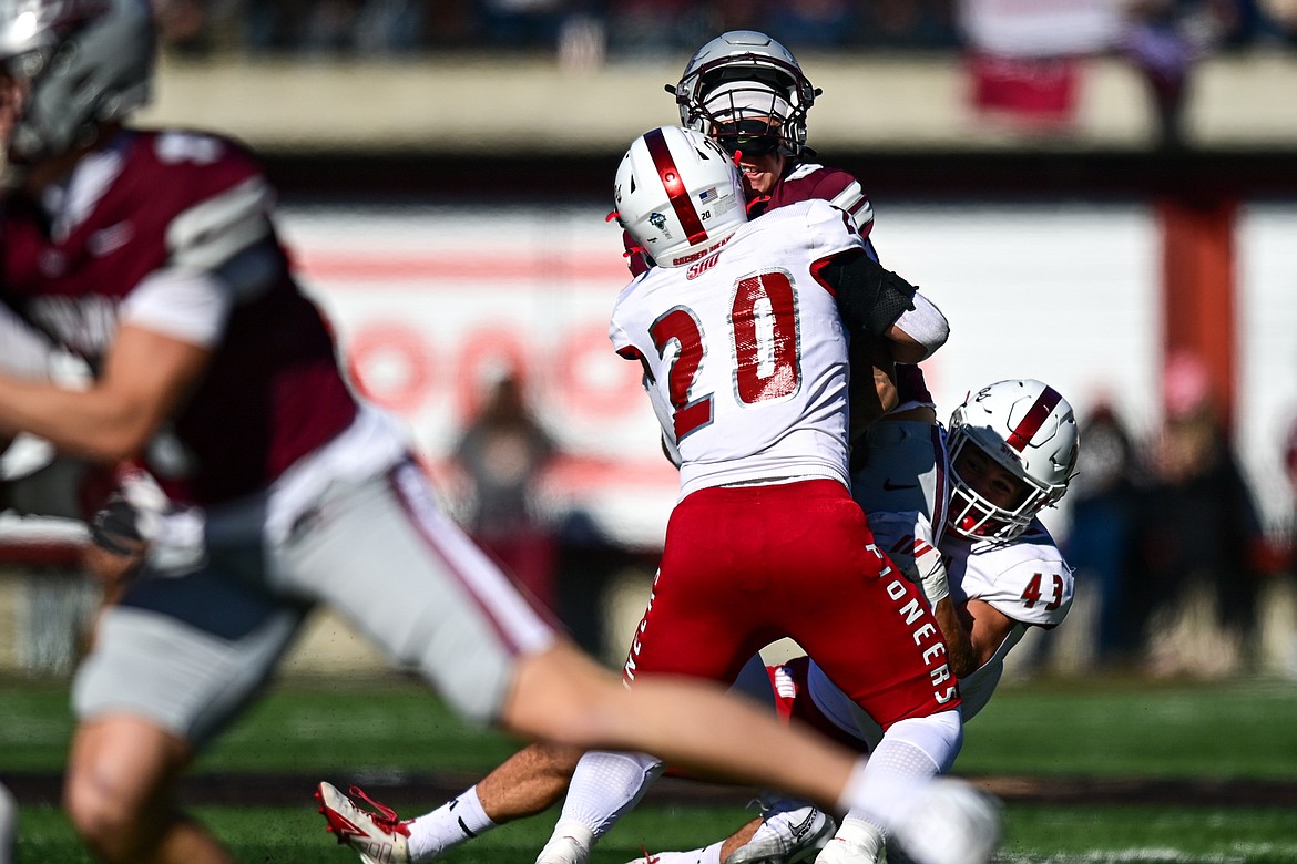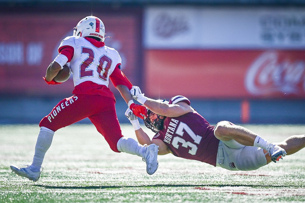 Grizzlies linebacker Clay Oven (37) makes a diving tackle of Sacred Heart running back Mitchell Summers (20) in the third quarter at Washington-Grizzly Stadium on Saturday, Oct. 18. (Casey Kreider/Daily Inter Lake)