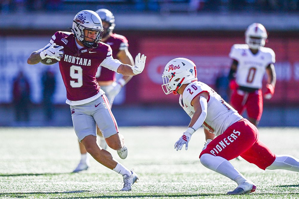 Grizzlies wide receiver Jordan Dever (9) picks up yardage on a 30-yard reception in the third quarter against Sacred Heart at Washington-Grizzly Stadium on Saturday, Oct. 18. (Casey Kreider/Daily Inter Lake)