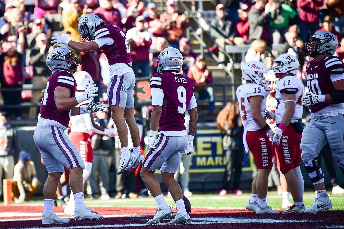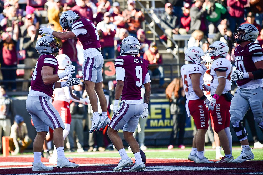 Grizzlies wide receiver Brooks Davis (3) celebrates after a two-point conversion after a touchdown in the first quarter against Sacred Heart at Washington-Grizzly Stadium on Saturday, Oct. 18. (Casey Kreider/Daily Inter Lake)
