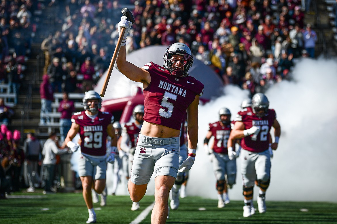 Grizzlies wide receiver Ian Finch (5) leads Montana onto the field before their matchup with Sacred Heart at Washington-Grizzly Stadium on Saturday, Oct. 18. (Casey Kreider/Daily Inter Lake)