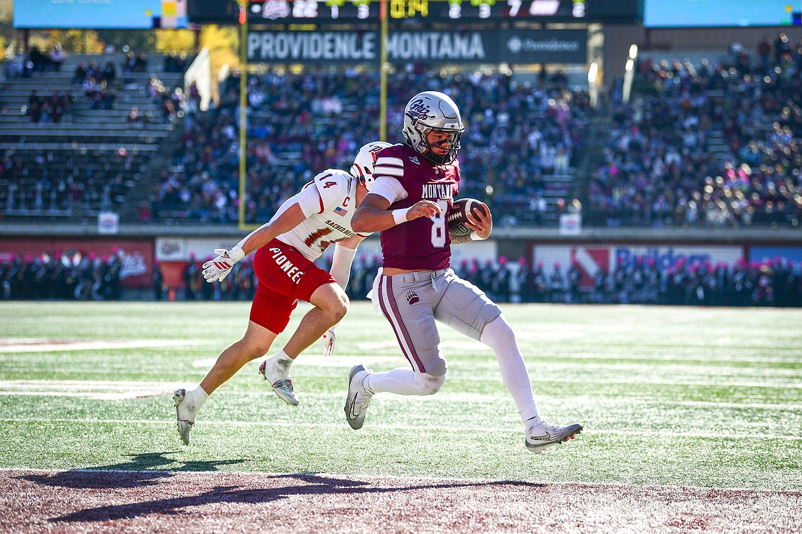 Grizzlies quarterback Keali'i Ah Yat (8) runs for a 3-yard touchdown in the second quarter against Sacred Heart at Washington-Grizzly Stadium on Saturday, Oct. 18. (Casey Kreider/Daily Inter Lake)