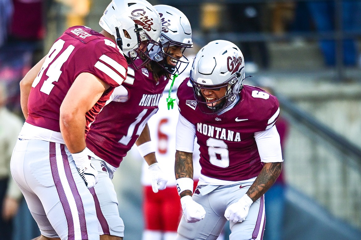 Grizzlies wide receiver Michael Wortham (6) celebrates with Korbin Hendrix (14) and Evan Schaefer (84) after a 51-yard touchdown reception in the fourth quarter at Washington-Grizzly Stadium on Saturday, Oct. 18. (Casey Kreider/Daily Inter Lake)