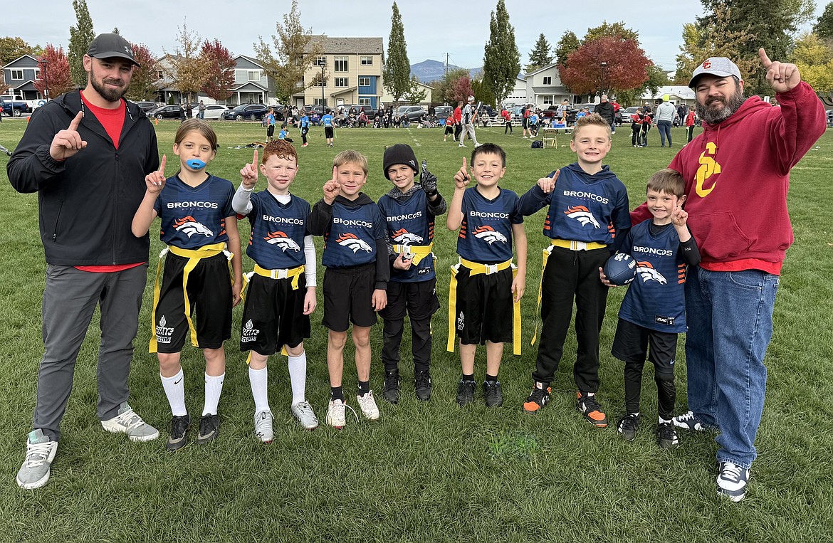 Courtesy photo The third/fourth grade Post Falls Park and Rec Broncos flag football team capped their undefeated season with a 38-0 win against the Bengals on Saturday. From left are coach Cody Rice, Sutton Jolley, Randy Seymour, Magnus Hutchinson, Hudson Helbling, Hudson Rheaume, Bentley Rice, Clayton Moss and coach Chris Moss.