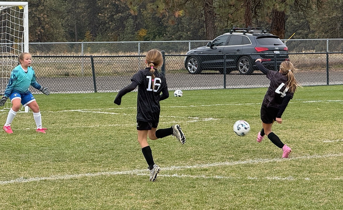 Courtesy photo The Sting SC 16 Girls Black soccer team played twice in Spokane last weekend, opening with a 4–1 win over WE Surf Elite White, then playing to a 0–0 draw against Shadow SA Golay. Pictured is Marlowe Rathbone of the Sting, taking a shot on goal, with Ezra Honsaker at left.