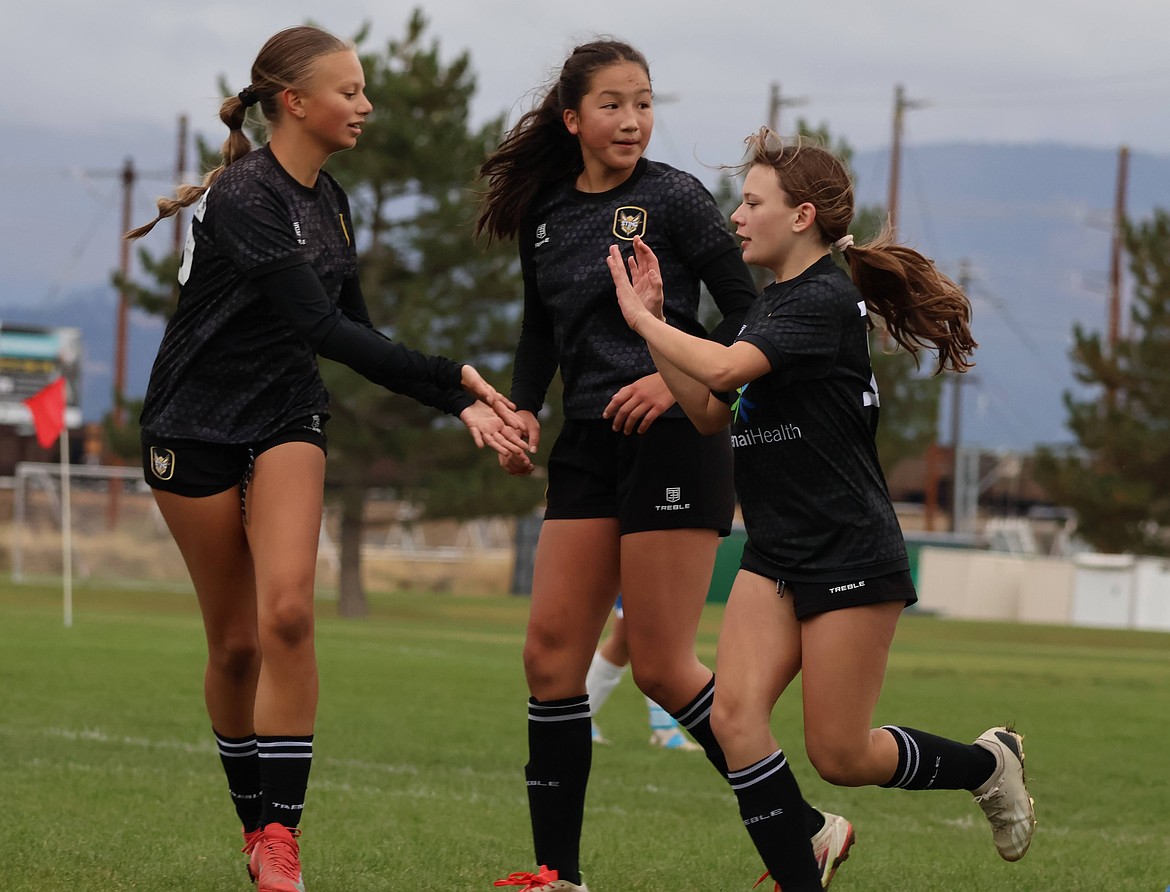 Photo by KAYLEAN MAY The Sting SC 2013 Girls Premier team beat Washington East Surf G14 Black 6-1 at Plante's Ferry Sports Complex in Spokane Valley on Sunday. Goals for the Sting were scored by Hayden Hays (3), Kyal Carlson (2) and Briella Ayers (1). Pictured at left for the Sting are Alexis Morisette, Amelia McGowan, and Briella Ayers.