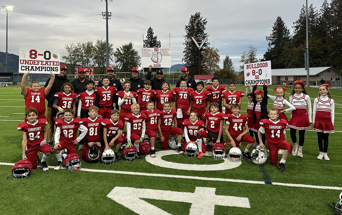 Full caption: The Sandpoint Affordable Football League's 5th Grade team recently finished off an 8-0 championship season where they outscored opponents by a 325-19 margin and posted five shutouts. The boys defeated Lakeland (40-6), Bonners Ferry (40-0), Silver Valley (34-0), Libby (68-0), Trojan Black (25-0), Patriots (38-7), Vikings (32-6) and Timberlake (48-0) on the year. Pictured, in no particular order are coaches Matt Wilson, Dan Huntchens, Brian Raykowski, Cody Bradshaw, Josh Delucchi and Mike Williams, and players, JD Wilson (#2), Conner Putman (#14), Doren Putman (#14), Christian Hernandez (#17), Gus Kuhn (#35), Fox James (#38), Benson Coffrain (#41), Wes Fournier (#42), Kaleb Erickson (#44), Maico Rodriguez (#51), Gunnar Williams (#60), Beau Bradshaw (#64), Lane Raykowski (#70), Carter Huntchens (#71), Eirnin Dunn (#72), Rory Smith (#73), Quinn Delucchi (#81), Kagen Oakes (#82), Logan Helm (#83), Jaxson Boecker (#84), Rocco Grillo (#86), Ryder Monteith (#89) and Timothy Franks (#90).