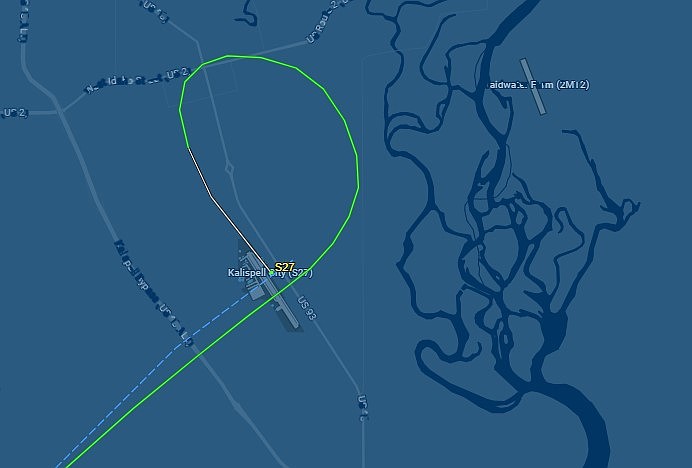 PUBLICLY AVAILABLE data shows the plane flying perpendicularly over the municipal airport's runway from the southwest before making a sharp loop over downtown Kalispell to align with the runway.