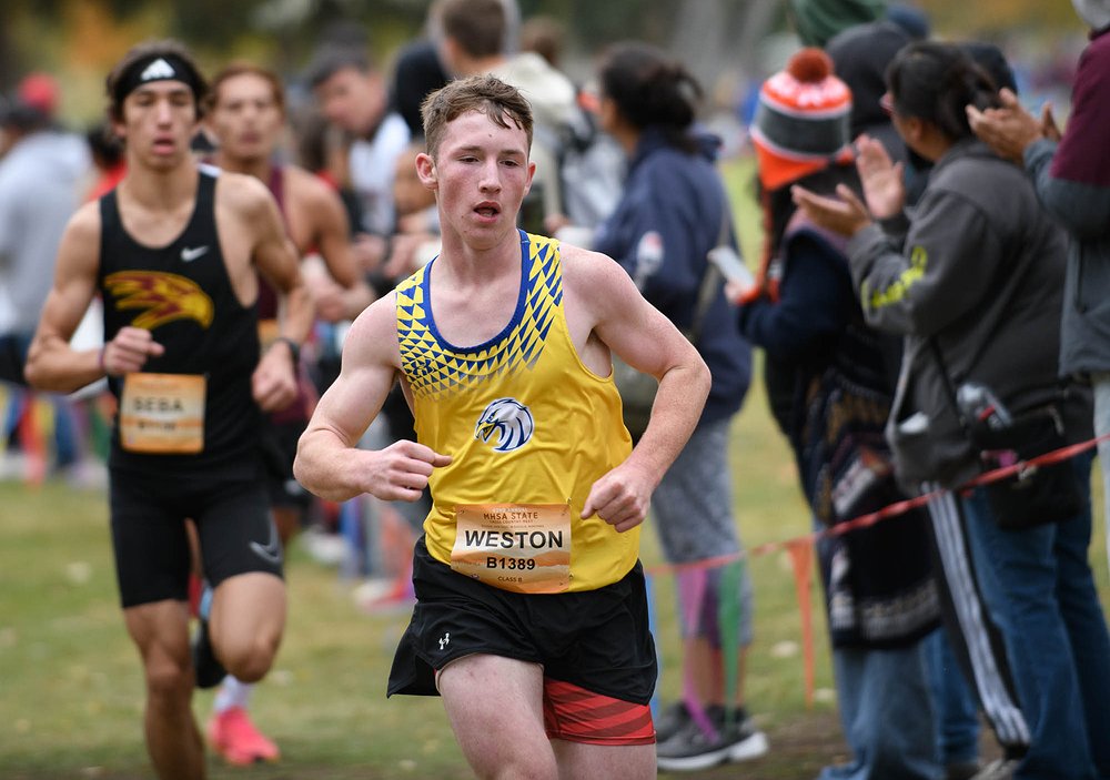 Sophomore Weston Block ran down 11th place and earned All-State B honors to lead the Blue Hawk boys, and Libby Franck, a precocious eighth grader, won 21st place in the girls race to lead the Hawk girls at the State B meet in Missoula Saturday.