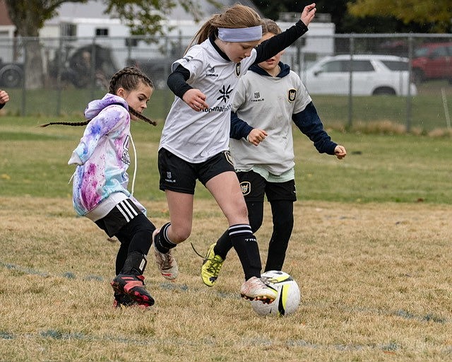 Photo by SEAN MARKS The Sting 16 Yellow Girls soccer team played a doubleheader Saturday at Canfield Sports Complex. In the first game, the Sting beat WE Surf G16 Elite White 4-1 with two goals by Teagan Erickson and two goals by Emersyn Barton. In the second game, the Sting played to a 2-2 draw with rival Spokane Legacy SA Slatter Pink. Emersyn Barton and Marlow Rathbone scored for The Sting. Kimberlyn Gatten and Abigail Marks had numerous saves in goal. Pictured is Makenzie Evans of the Sting, dribbling around a defender.