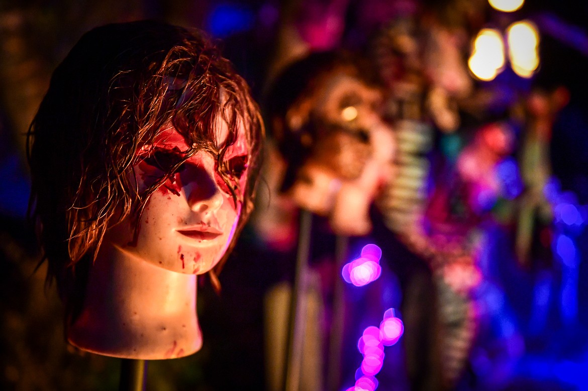 A flickering light shines on a mannequin's face, its body partially covered by a sheet on a makeshift operating table surrounded by severed limbs.