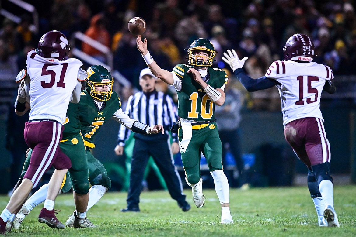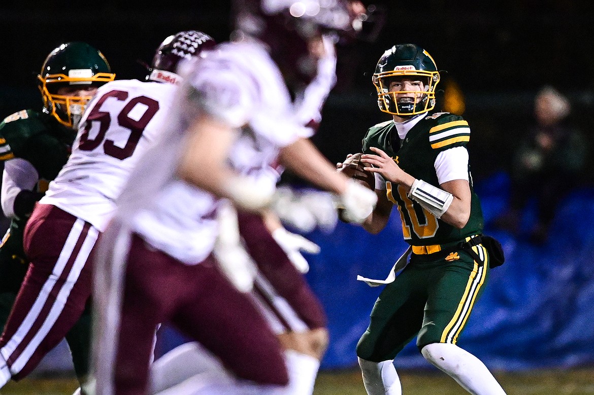 Whitefish quarterback Luke Dalen (10) looks to pass in the second quarter against Butte Central in a Class A playoff game at Memorial Field on Friday, Oct. 31. (Casey Kreider/Daily Inter Lake)