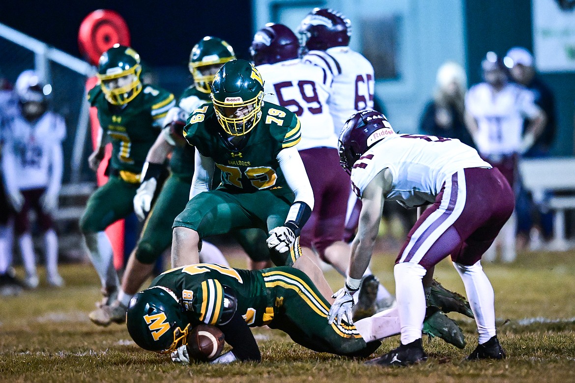Whitefish linebacker Sam Nissen (28) recovers a fumble in the third quarter against Butte Central in a Class A playoff game at Memorial Field on Friday, Oct. 31. (Casey Kreider/Daily Inter Lake)