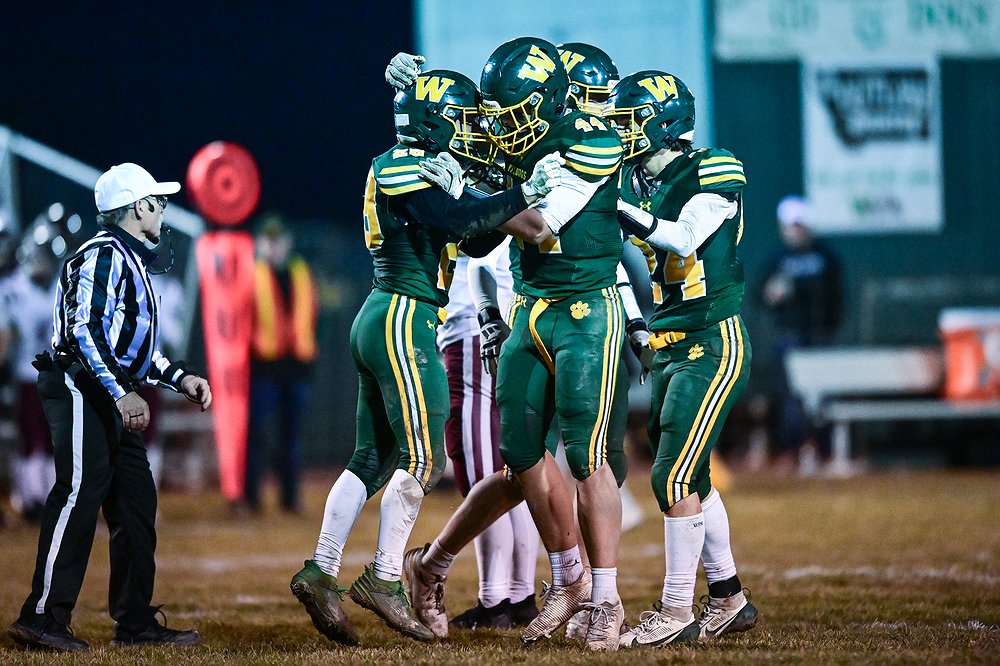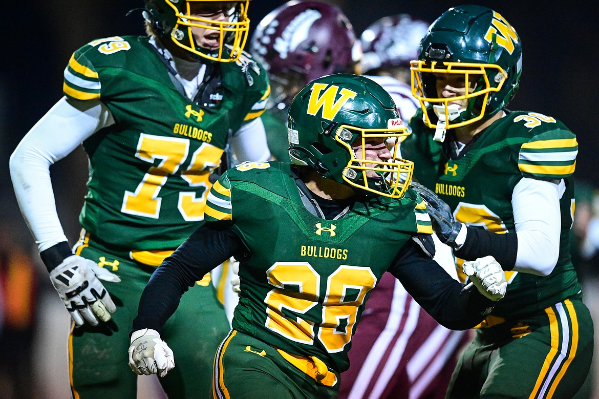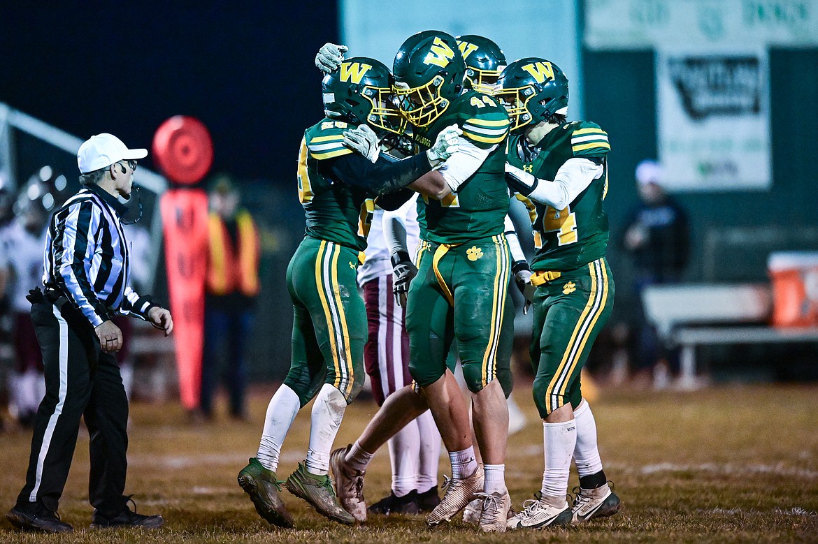 Whitefish defenders Leo Bungener (79), Sam Nissen (28) and Keenan Curtiss (30) celebrate after a sack by Nissen and Jayke Thew in the third quarter of a Class A playoff game at Memorial Field on Friday, Oct. 31. (Casey Kreider/Daily Inter Lake)