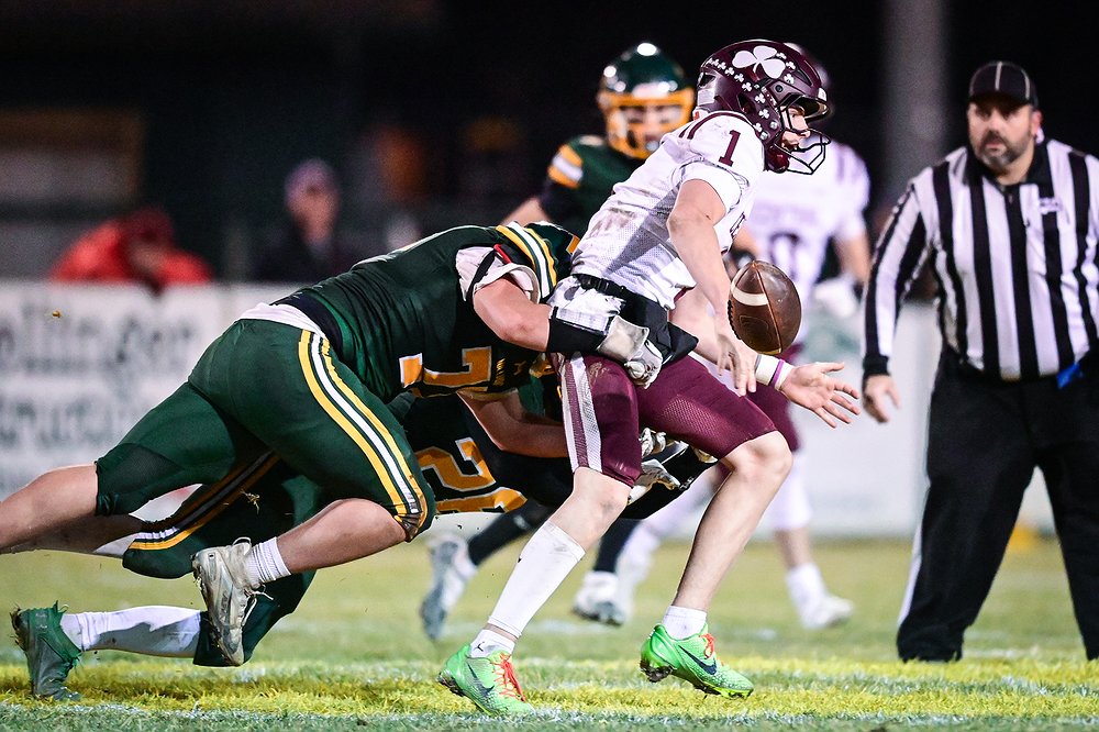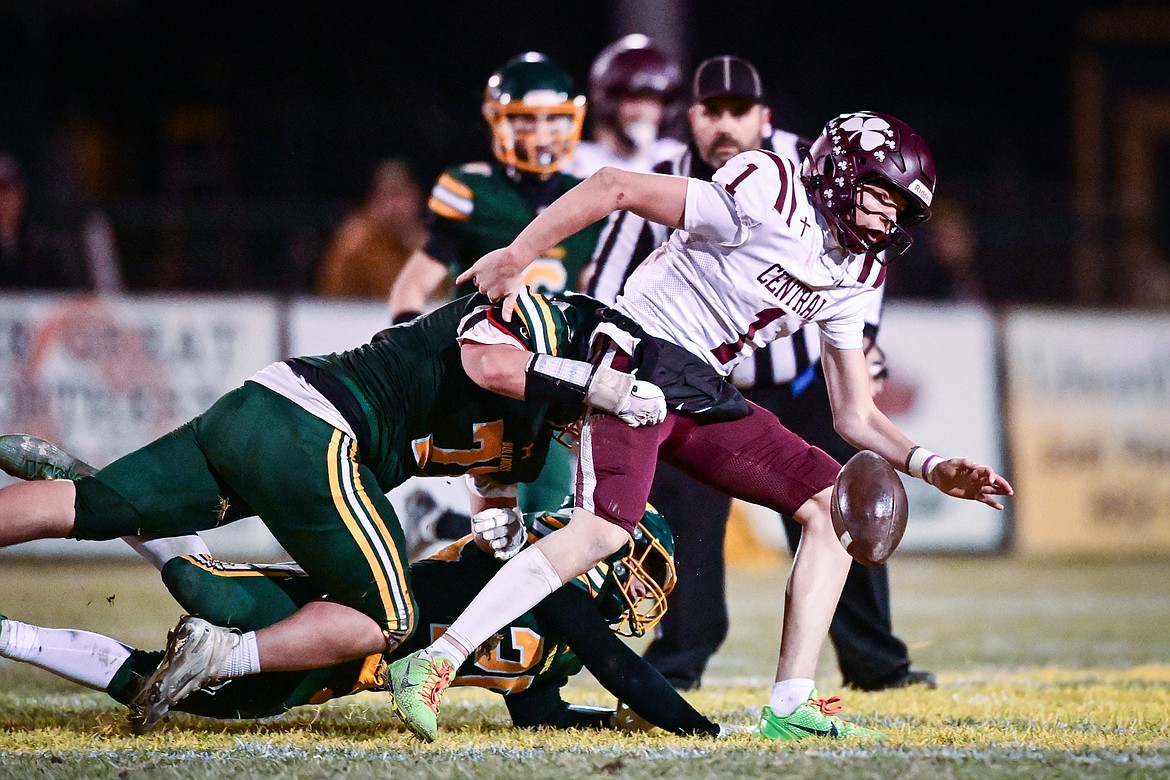 Whitefish defensive lineman Leo Bungener (79) forces a fumble by Butte Central quarterback Ryan Peoples (1) in the third quarter in a Class A playoff game at Memorial Field on Friday, Oct. 31. (Casey Kreider/Daily Inter Lake)