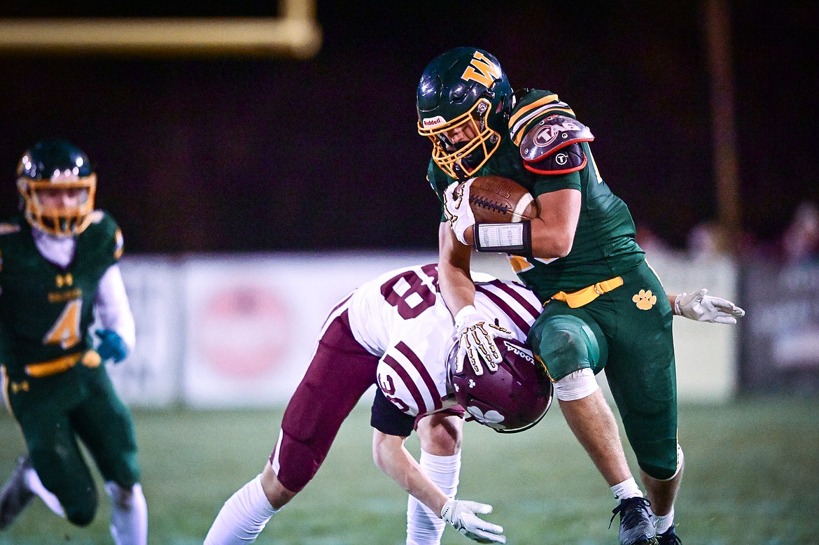 Whitefish wide receiver Vlad Shestak (5) picks up extra yardage on a run in the third quarter against Butte Central in a Class A playoff game at Memorial Field on Friday, Oct. 31. (Casey Kreider/Daily Inter Lake)