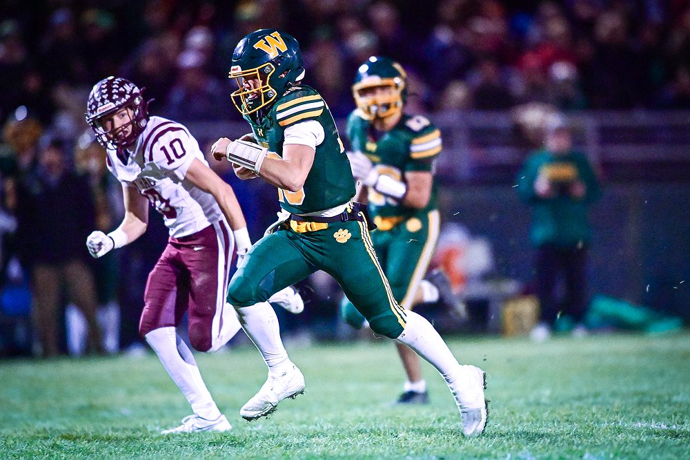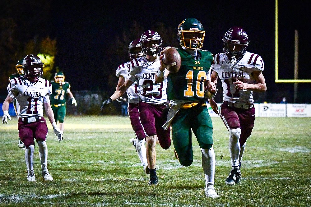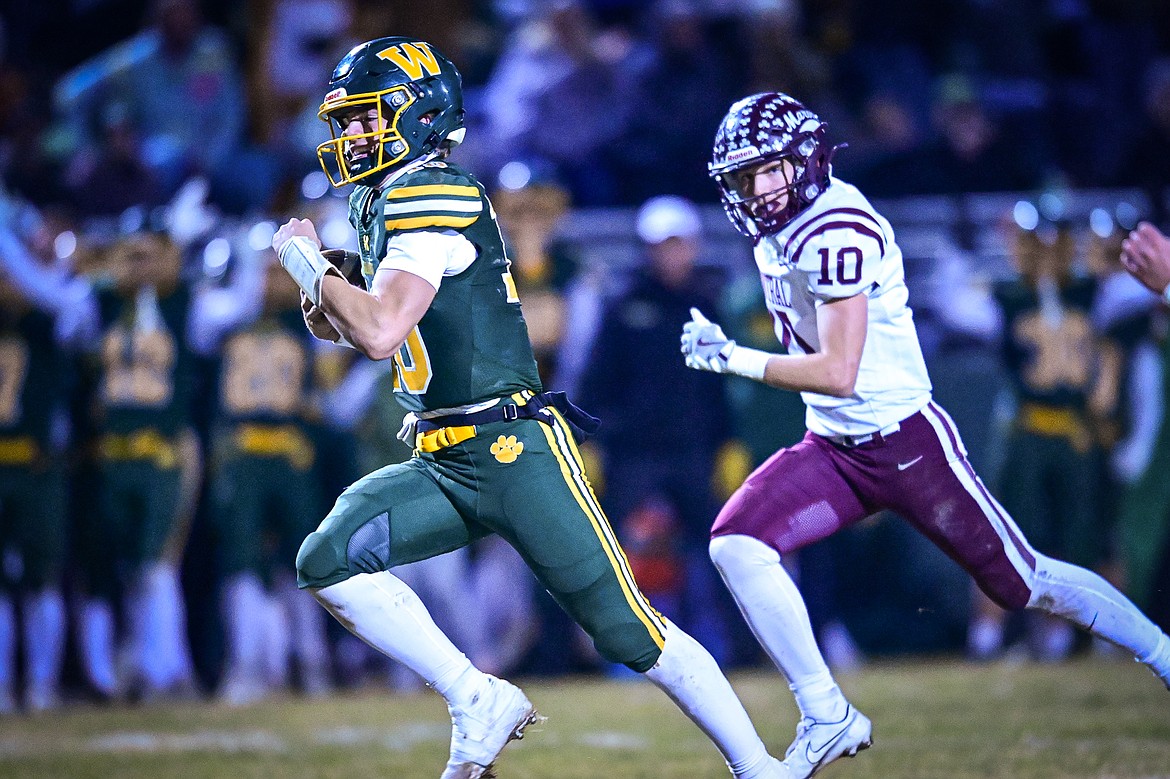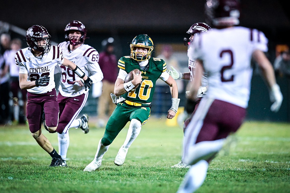 Whitefish quarterback Luke Dalen (10) weaves downfield on a 38-yard touchdown run before the end of the second quarter against Butte Central in a Class A playoff game at Memorial Field on Friday, Oct. 31. (Casey Kreider/Daily Inter Lake)