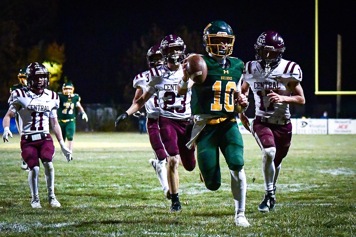 Whitefish quarterback Luke Dalen (10) scores a touchdown on a 38-yard run in the second quarter against Butte Central in a Class A playoff game at Memorial Field on Friday, Oct. 31. (Casey Kreider/Daily Inter Lake)