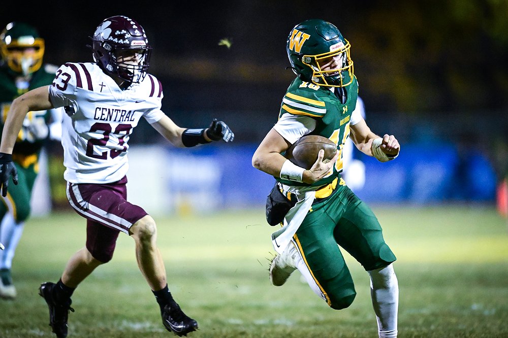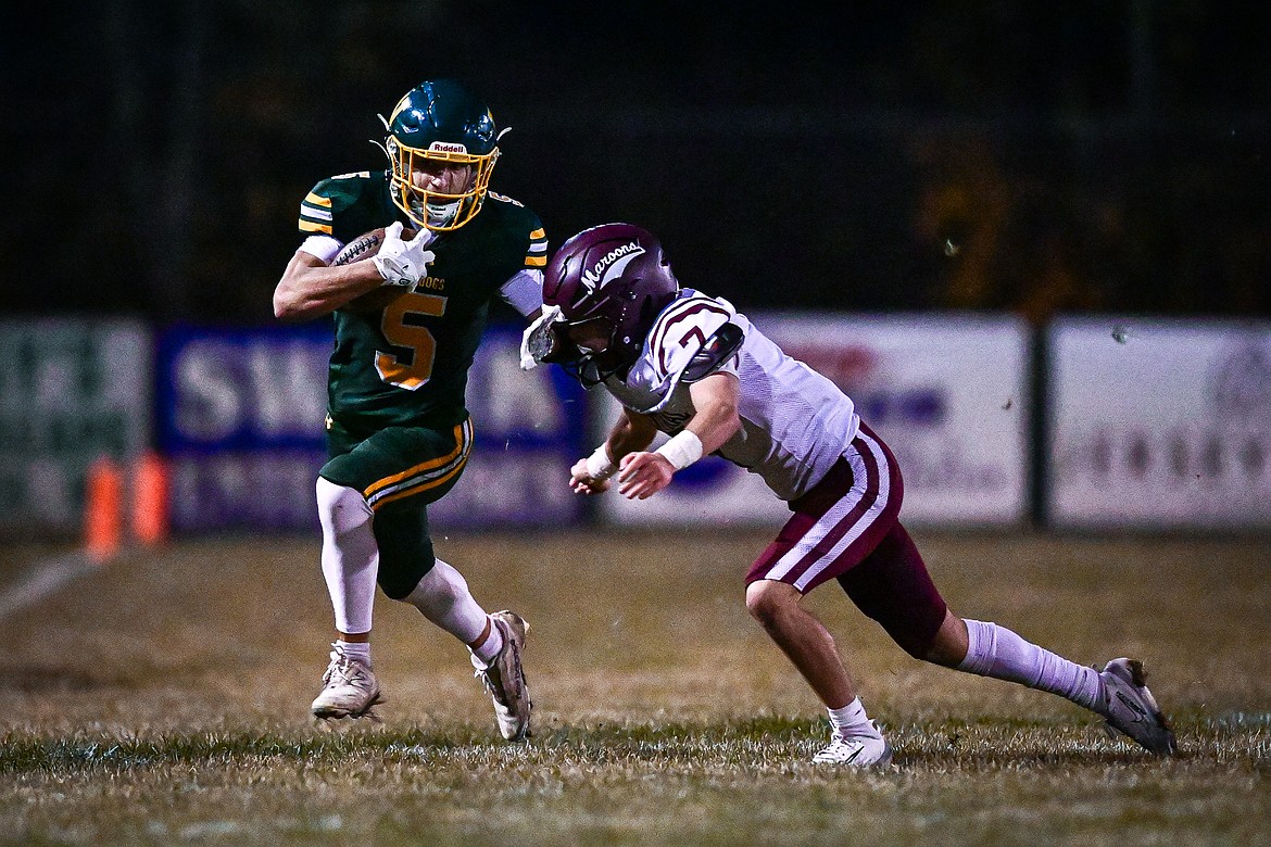 Whitefish wide receiver Vlad Shestak (5) picks up yardage after a reception in the first half against Butte Central in a Class A playoff game at Memorial Field on Friday, Oct. 31. (Casey Kreider/Daily Inter Lake)