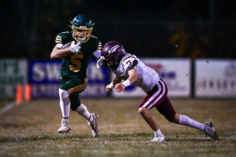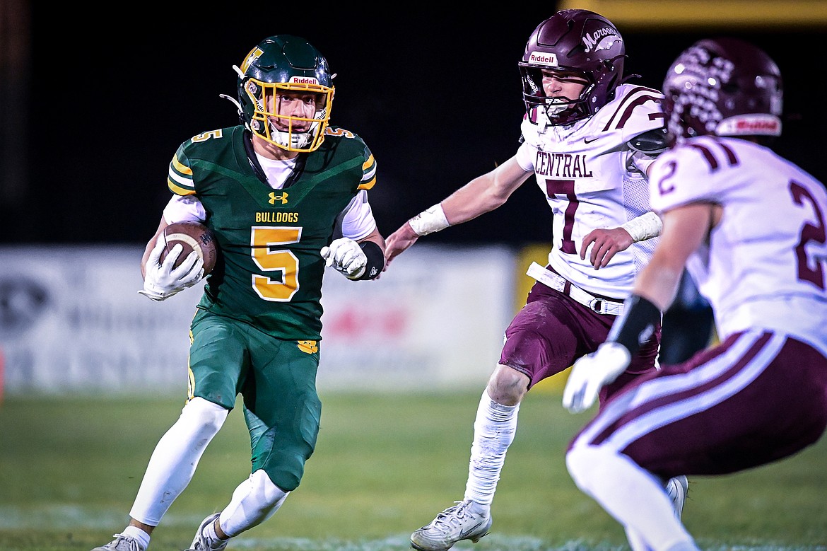 Whitefish wide receiver Vlad Shestak (5) picks up yardage on a run in the second quarter against Butte Central in a Class A playoff game at Memorial Field on Friday, Oct. 31. (Casey Kreider/Daily Inter Lake)