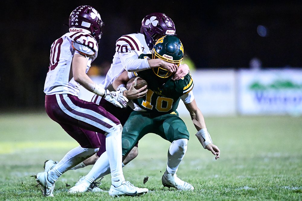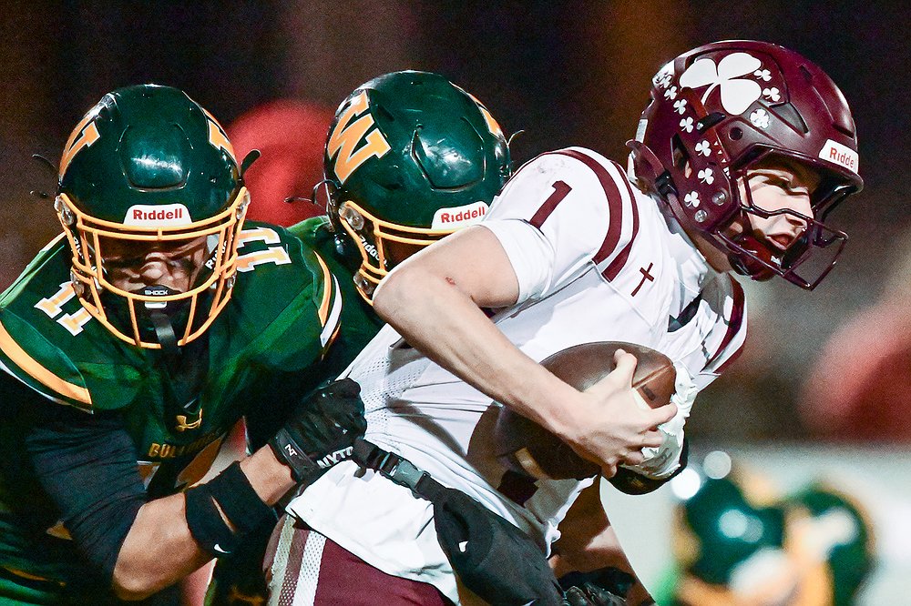 Whitefish defenders Jayke Thew (11) and Sam Nissen (28) sack Butte Central quarterback Ryan Peoples (1) in the third quarter of a Class A playoff game at Memorial Field on Friday, Oct. 31. (Casey Kreider/Daily Inter Lake)