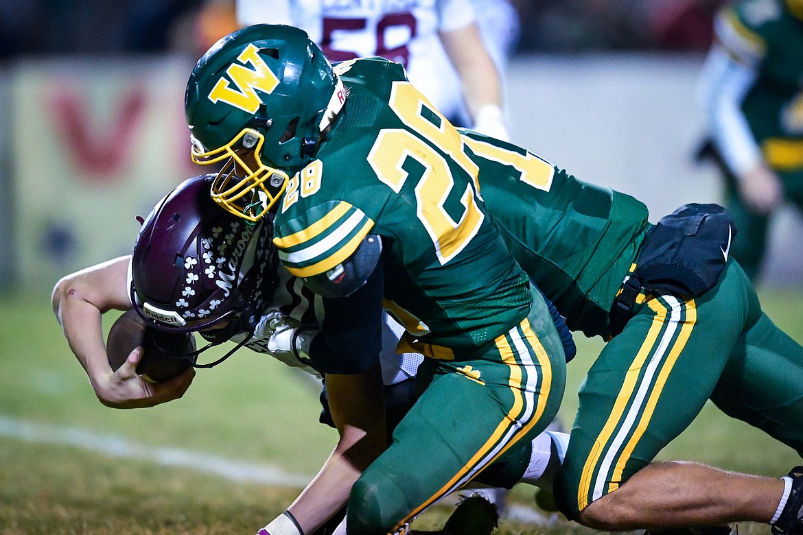 Whitefish defenders Sam Nissen (28) and Jayke Thew (11) sack Butte Central quarterback Ryan Peoples (1) in the third quarter of a Class A playoff game at Memorial Field on Friday, Oct. 31. (Casey Kreider/Daily Inter Lake)