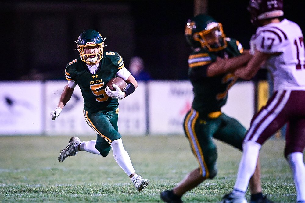 Whitefish wide receiver Vlad Shestak (5) picks up yardage on a run in the third quarter against Butte Central in a Class A playoff game at Memorial Field on Friday, Oct. 31. (Casey Kreider/Daily Inter Lake)