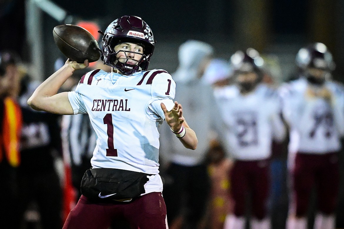 Butte Central quarterback Ryan Peoples (1) drops back to pass in the third quarter against Whitefish in a Class A playoff game at Memorial Field on Friday, Oct. 31. (Casey Kreider/Daily Inter Lake)