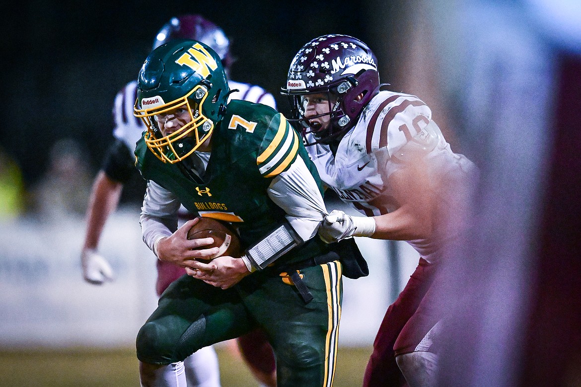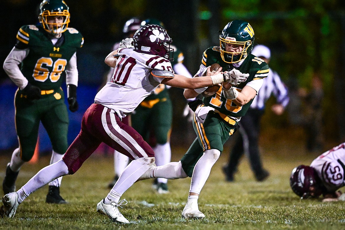 Whitefish quarterback Luke Dalen (10) picks up yardage on a run in the second quarter against Butte Central in a Class A playoff game at Memorial Field on Friday, Oct. 31. (Casey Kreider/Daily Inter Lake)