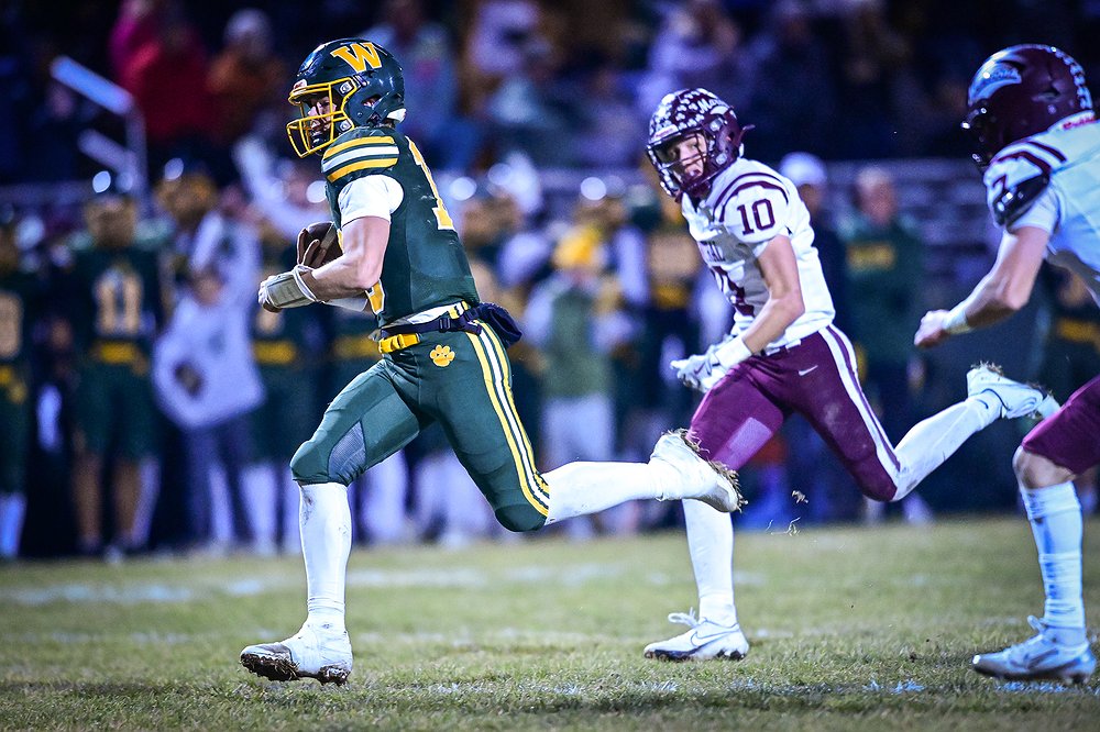 Whitefish quarterback Luke Dalen (10) picks up yardage on a run in the third quarter against Butte Central in a Class A playoff game at Memorial Field on Friday, Oct. 31. (Casey Kreider/Daily Inter Lake)