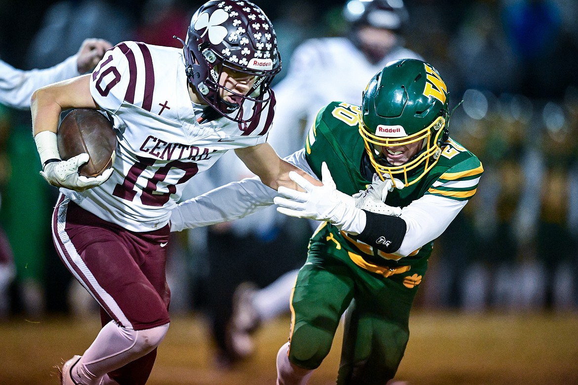 Whitefish wide receiver Sam Rainford (20) picks up yardage after a reception in the third quarter against Butte Central in a Class A playoff game at Memorial Field on Friday, Oct. 31. (Casey Kreider/Daily Inter Lake)