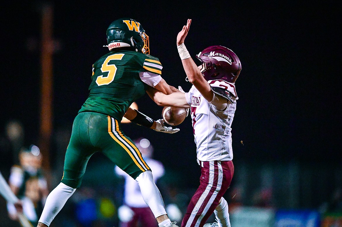 Whitefish wide receiver Vlad Shestak (5) makes a leaping catch downfield in the first quarter against Butte Central in a Class A playoff game at Memorial Field on Friday, Oct. 31. (Casey Kreider/Daily Inter Lake)