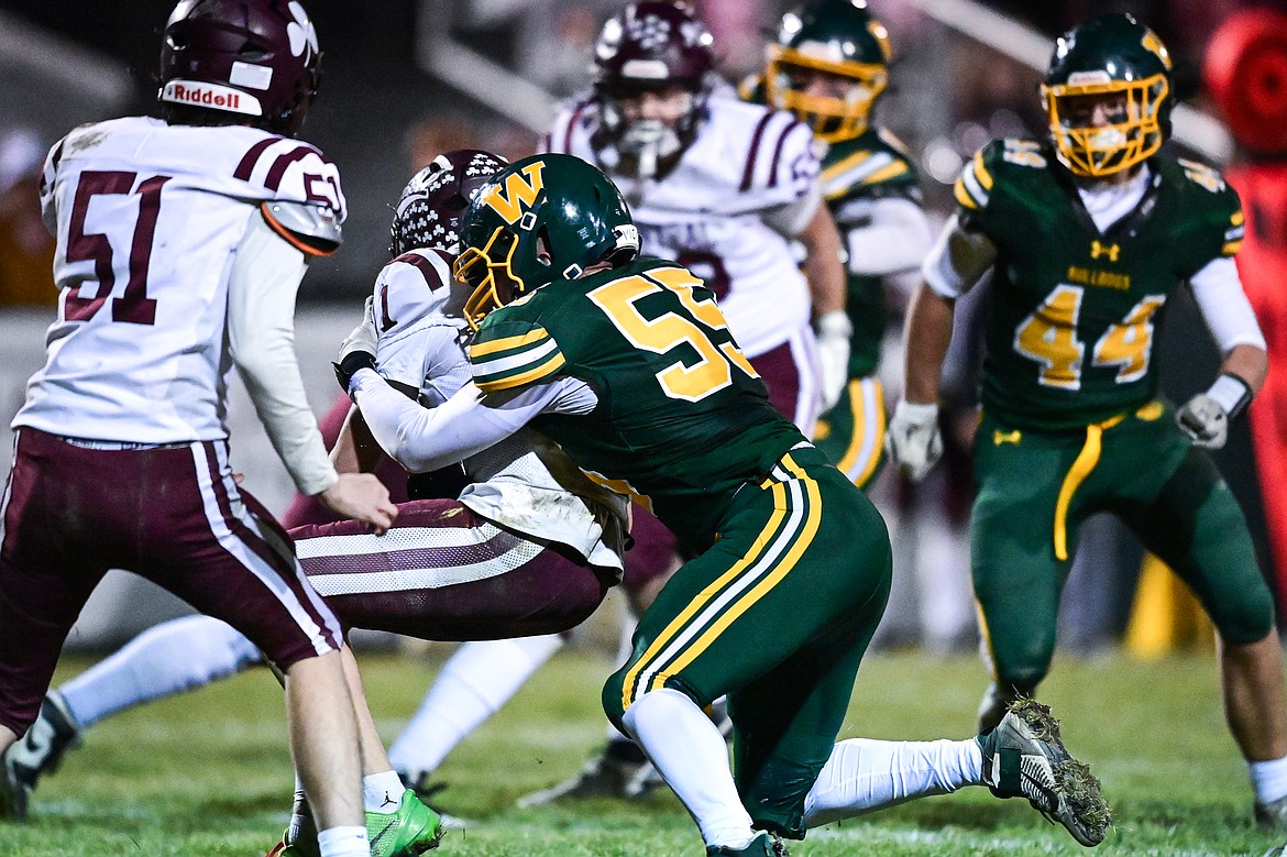 Whitefish defensive lineman Braylon Dunn (55) sacks Butte Central quarterback Ryan Peoples (1) in the third quarter of a Class A playoff game at Memorial Field on Friday, Oct. 31. (Casey Kreider/Daily Inter Lake)