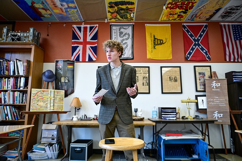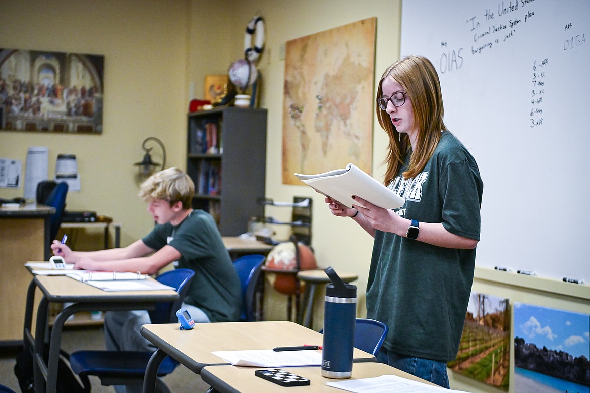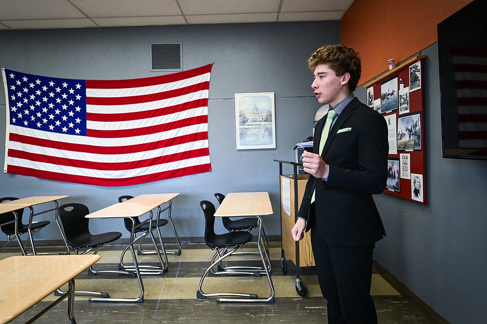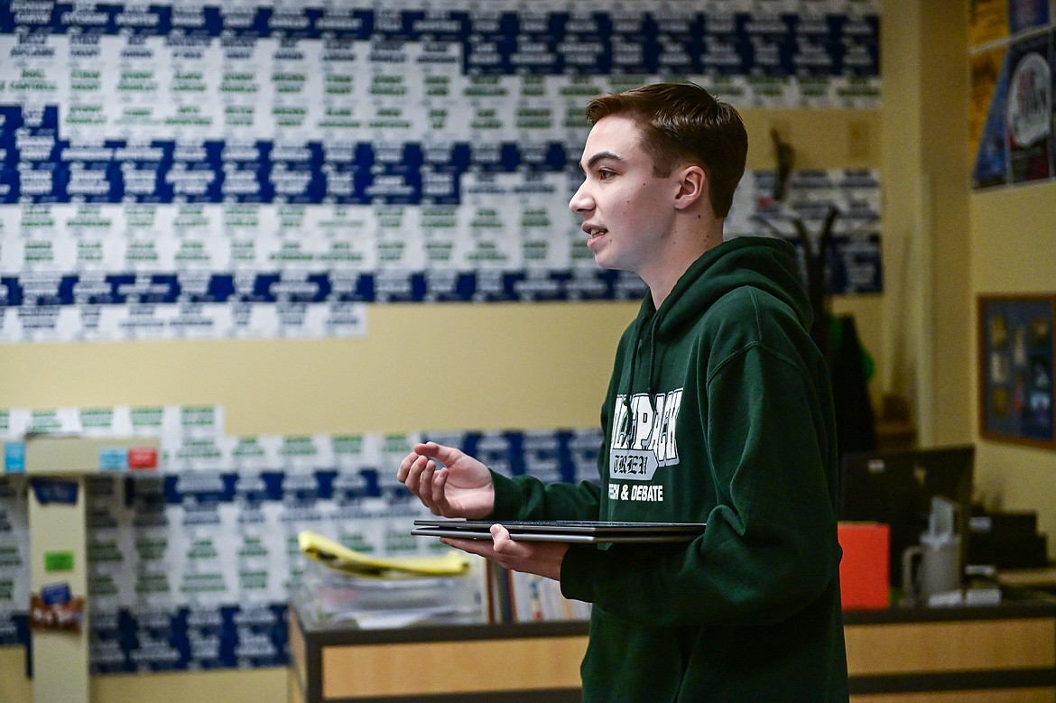 Flathead High's Jake Milone recites his extemporaneous speech in front of a judge during speech and debate practice at the high school on Saturday, Oct. 25. (Casey Kreider/Daily Inter Lake)