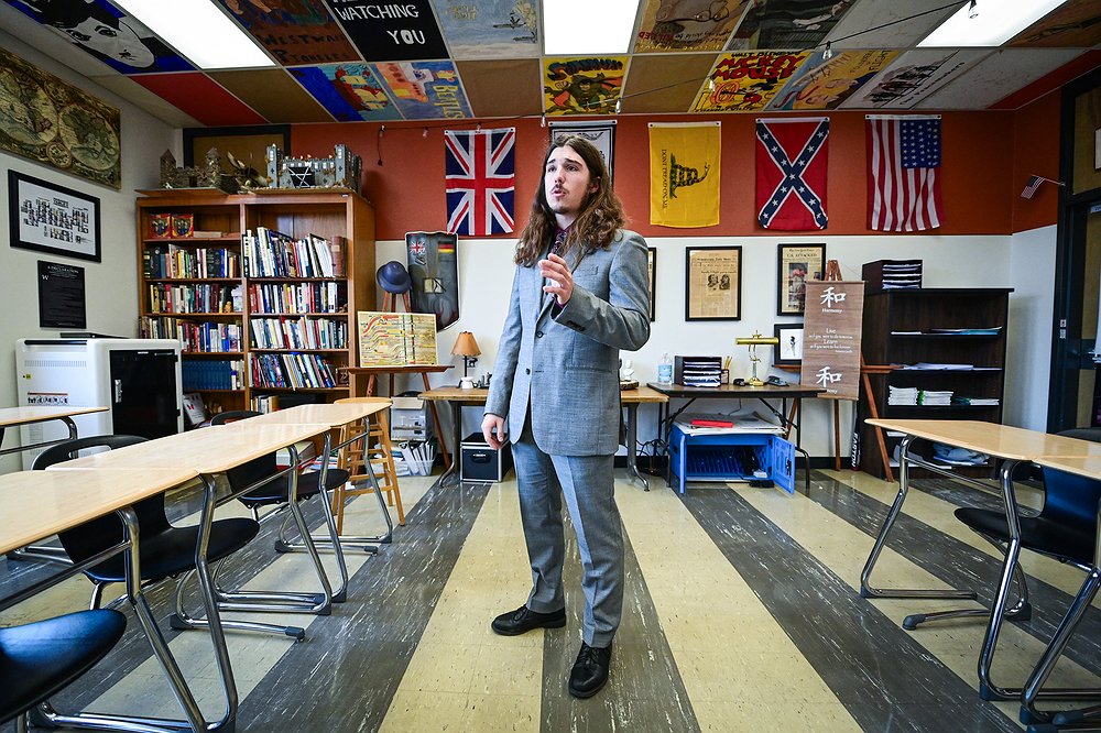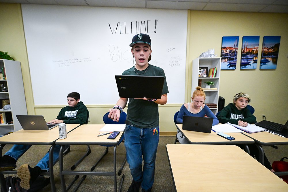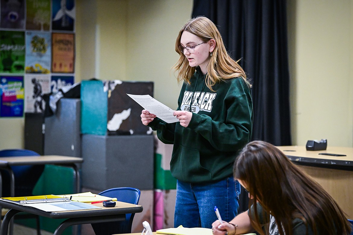 Flathead High's Dalton Howser recites his extemporaneous speech in front of a judge during speech and debate practice at the high school on Saturday, Oct. 25. (Casey Kreider/Daily Inter Lake) ARTICLES BY HILARY MATHESON