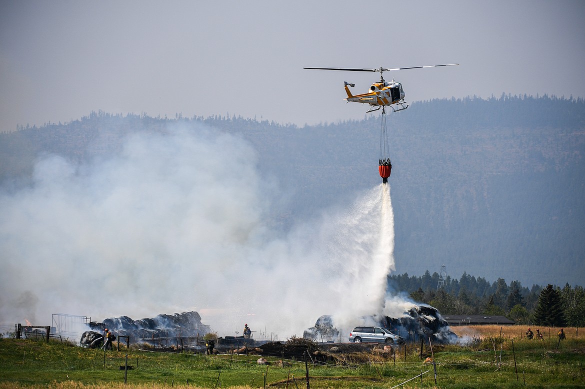 Their efforts included the use of two helicopters, which carried water from Ashley Creek across U.S. 2 to minimize the spread of the fire toward neighboring homes and commercial buildings. Firefighters also used an excavator to separate burning bales of hay while crews doused the flames with a hose.